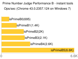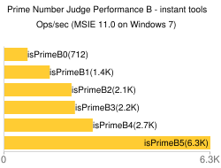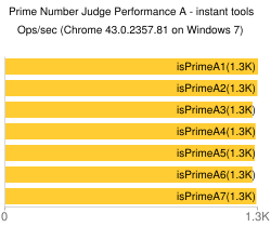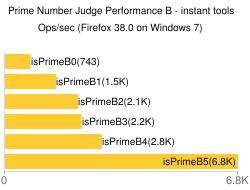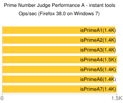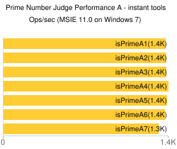 意外なことに、この全てのコード・すべてのブラウザで有意な差は出ませんでした。 強いて言うとIEでisPrimeA7がわずかに他より遅くなったことと、 「Chrome < IE < Firefox」という傾向がうっすらとありました。